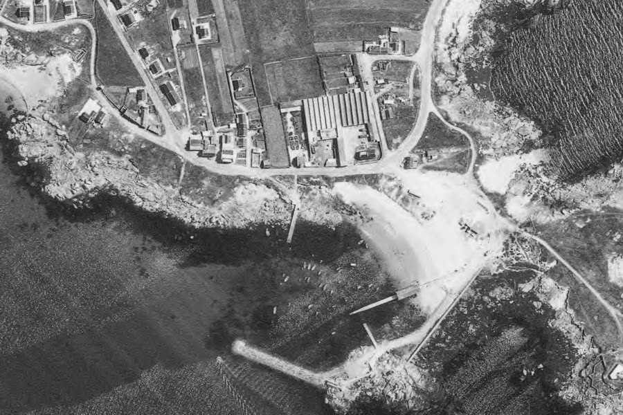 On perçoit le chantier de construction de la digue en bas de l’image et la conserverie en haut.