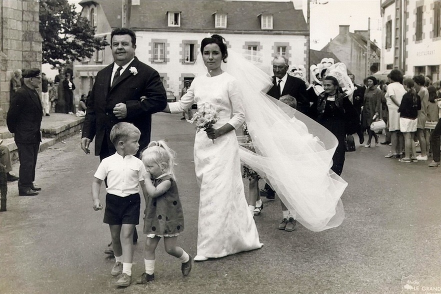 Ouf ! Dans la boutique, il y a bien une jolie paire de chaussures à ma pointure mais elles sont à talons. Allez on les prend, pas le choix ! À peine chaussées, en route pour la grande aventure… Il y a beaucoup de curieux : touristes, Névéziens, Tréguncois… Tous les beaux costumes et belles coiffes bretonnes sont de sortie. Les commérages vont bon train… le centre du bourg est bloqué, pas de voitures. Il faut au moins cela pour que le cortège précédé de sonneurs se mette en place et que chacun retrouve sa chacune pour aller à l’église.