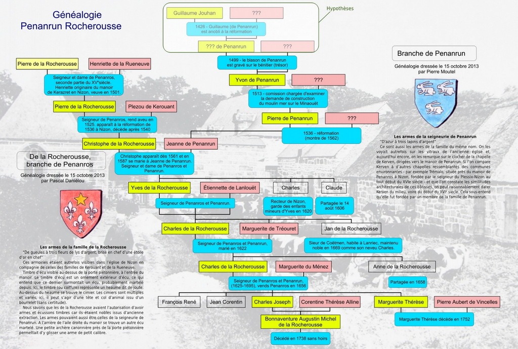 Les de la Rocherousse6 de Penanros sont issus d’une vieille famille noble originaire dudit lieu en Quessoy. La branche aînée de la Rocherousse se fond au XVe siècle dans Keymerc’h, puissante baronnie de Bannalec ; cette famille dite de Keymerc’h possède alors la seigneurie de la Rocherousse en Quessoy, mais aussi la seigneurie de Kergunus à Trégunc (entre autre). Par conséquent, Pierre de la Rocherousse, chef de la branche juveigneure (cadette), issue d’autre juveigneurie de la maison de la Rocherousse, devient donc chef de nom et armes de la Rocherousse. Pierre, décédé avant 1501, est le grand-père de Christophe.