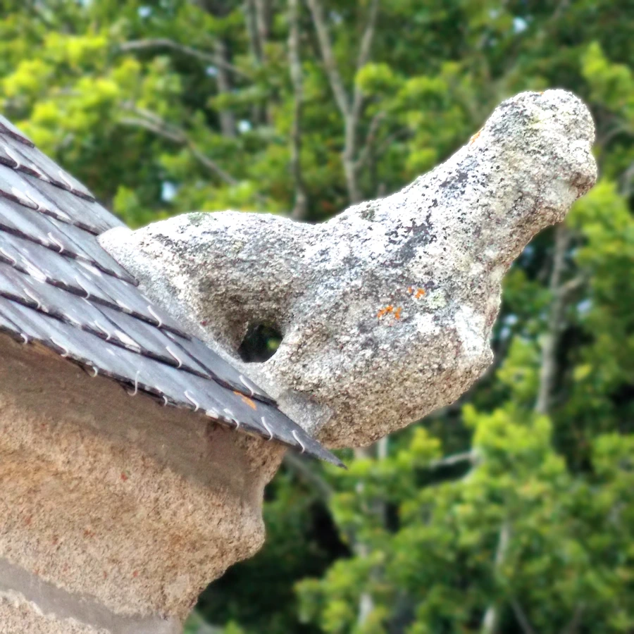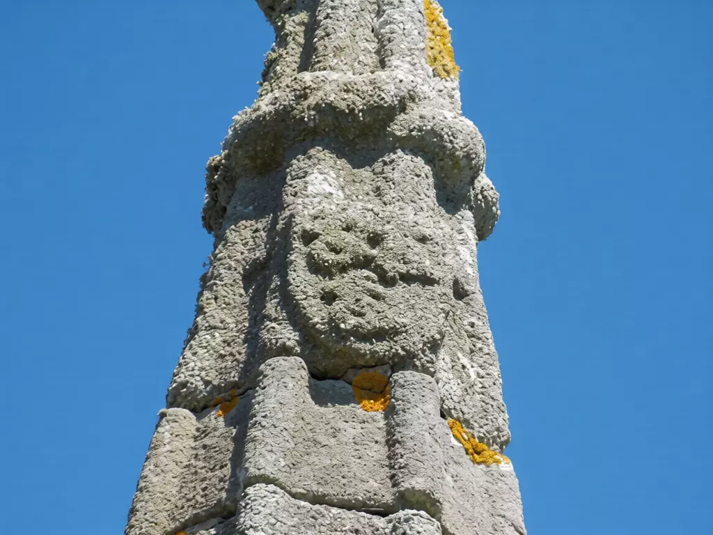 Le timbre d’écu est un ornement extérieur d’écu, ce qui entend que ce dernier surmontait un écu probablement martelé depuis. Ici, le timbre (ou coiffure) représente un heaume dit “de joute”. Au-dessus du heaume se trouve le cimier. Les cimiers sont multiples et variés. Ici, il pourrait s’agir d’une tête et col d’animal issu d’un bourrelet. L’écu pouvait contenir les armes de la seigneurie de Penanrun (le plus probable) ou bien celles de la Rocherousse qui avaient l’autorisation “d’avoir armes et écussons timbres” puisque nobles issus d’ancienne extraction. À l’arrière de l’aile droite du manoir se trouve un autre écu martelé. À noter, la présence d‘une petite archère canonnière près de la porte piétonnière permettant d’y glisser une arme de petit calibre.