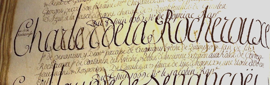 Début de l’acte de 1610 : Le huitième jour d’octobre après midi l’an 1610, notre cour de Concq Foesnant et Rospreden devant nous notaires royaux soussignants sont comparu en personne seigneur Yves de la Rocherouxe sieur de Penanros et Penanrun, et est en nom et comme héritier et exécuteur du testament de dernière volonté de feu seigneur Louys de Penanrun vivant sieur dudit lieu, demeurant en son manoir de Penanros en la paroisse de Nizon, Guénolay Furic à présent procureur fabrique de l’église paroissiale de Trégunc demeurant au manoir de la Motte en la paroisse de Trégunc et Pezron Morvan demeurant au village de Kernalec, prédite paroisse de Trégunc d’une part et d’autre (…)