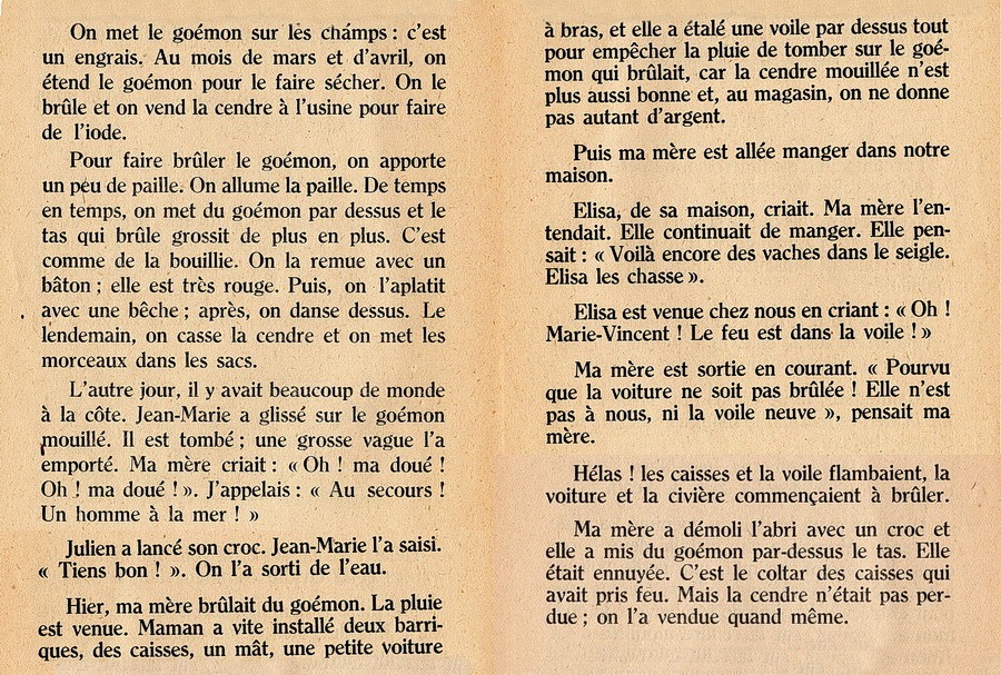 Francis Richard témoignait également de cette période qu’il avait connue ; on brûlait le goémon dans des trous que l’on creusait dans la dune et que l’on entourait de pierres pour empêcher le sable d’y tomber. Cela se faisait entre Karreg Velen et la chaumière de Feunteun Aodou. Aux beaux jours quand le goémon brûlait, de la mer, on voyait toute la côte enfumée.