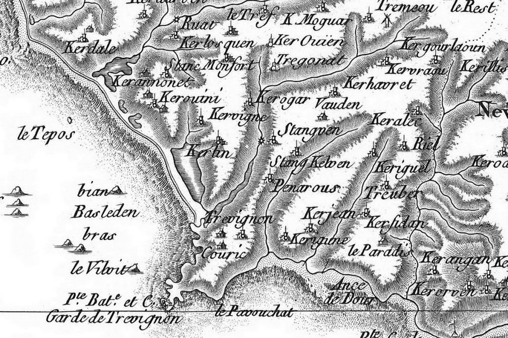 24. Dans les années 1770 et 1780, parmi les propriétaires de Stangven se trouvent Corentin Cadiou (également possesseur de biens à Trégonal), Jean Hervé, les enfants d’André Capiten, Charles-Jullien Prinsac 1, Yves Robigou, Jacques Aubert de Vincelles seigneur de Penanrun et les enfants de Louis Portal ↩︎