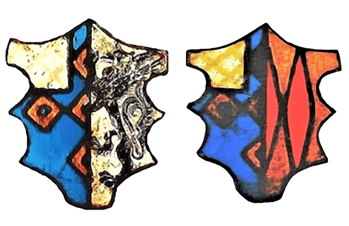 Ces deux vitraux armoriés symbolisent l’union de la seigneurie de la Porte-Neuve avec celles de Kervichart et du Hénant, conséquence du mariage de Françoise de Kerguégant avec Charles de Guer, ils datent donc du XVIe siècle. Ils étaient autrefois posés dans l’ancienne église de Névez, ils ont été sauvés et déplacés avec d’autres par M. Hersart de La Villemarqué, alors propriétaire du manoir du Poulguin, lors de la destruction de l’église à la fin du XIXe siècle, ils sont aujourd’hui présents dans les vitres du Poulguin. Notons que le griffon de sable a été attribué à tort à la famille Morillon de la Porte-Neuve (d’or au griffon de gueules armé de sable).