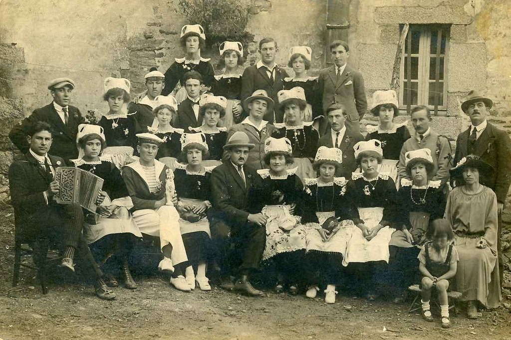 Dans les années 30, le costume breton pour les femmes était de rigueur dans les mariages à Trégunc. Pour la photo, les hommes étaient têtes nues, sauf les marins qui portaient encore la casquette. Marjann, la mariée est habillée en costume blanc avec dentelles et brodée de fleurs, (ce costume sera teint en noir après la cérémonie), la coiffe de Trégunc bien amidonnée, avec les plis ondulés, réalisés avec de la paille sélectionnée, et repassée au fer à charbon de bois par Francine Nerriec de Pont-Prenn. Toutes les femmes de cette époque portaient la coiffe, celle-ci disparaît des mariages dans les années 50. Youenn, le marié, est habillé d’un costume taillé sur mesure, par le tailleur d’habits Louis Le Beux (Louis Chemener) de la rue de Concarneau au bourg et d’un nœud papillon.
