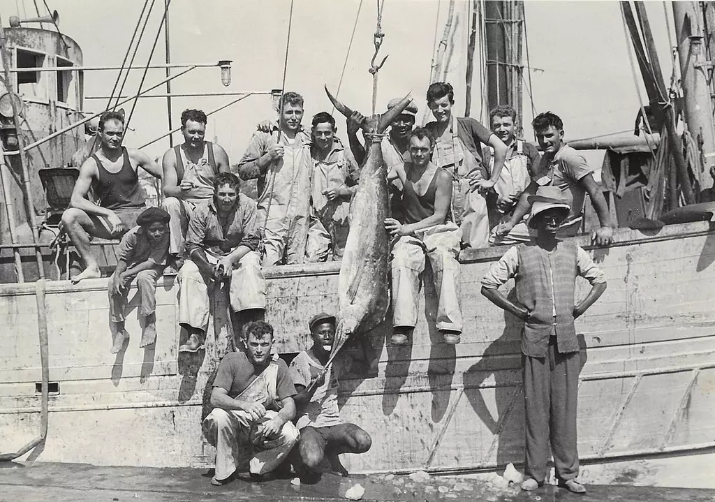 En 1930, un thonier ligneur à tangons capture en moyenne cinq tonnes de thon par an.