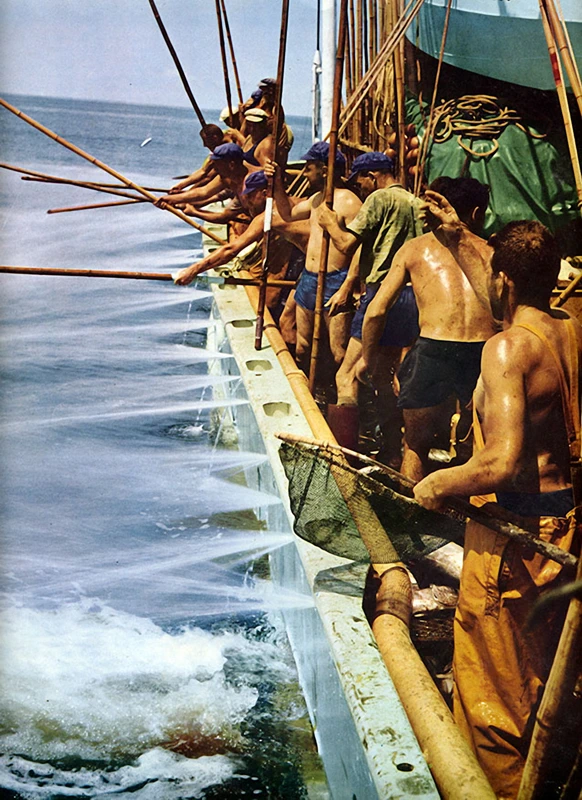 Les thoniers de cette époque pratiquent la pêche au thon à l’appât vivant, en général de la sardine, et parfois de petits chinchards et des maquereaux.