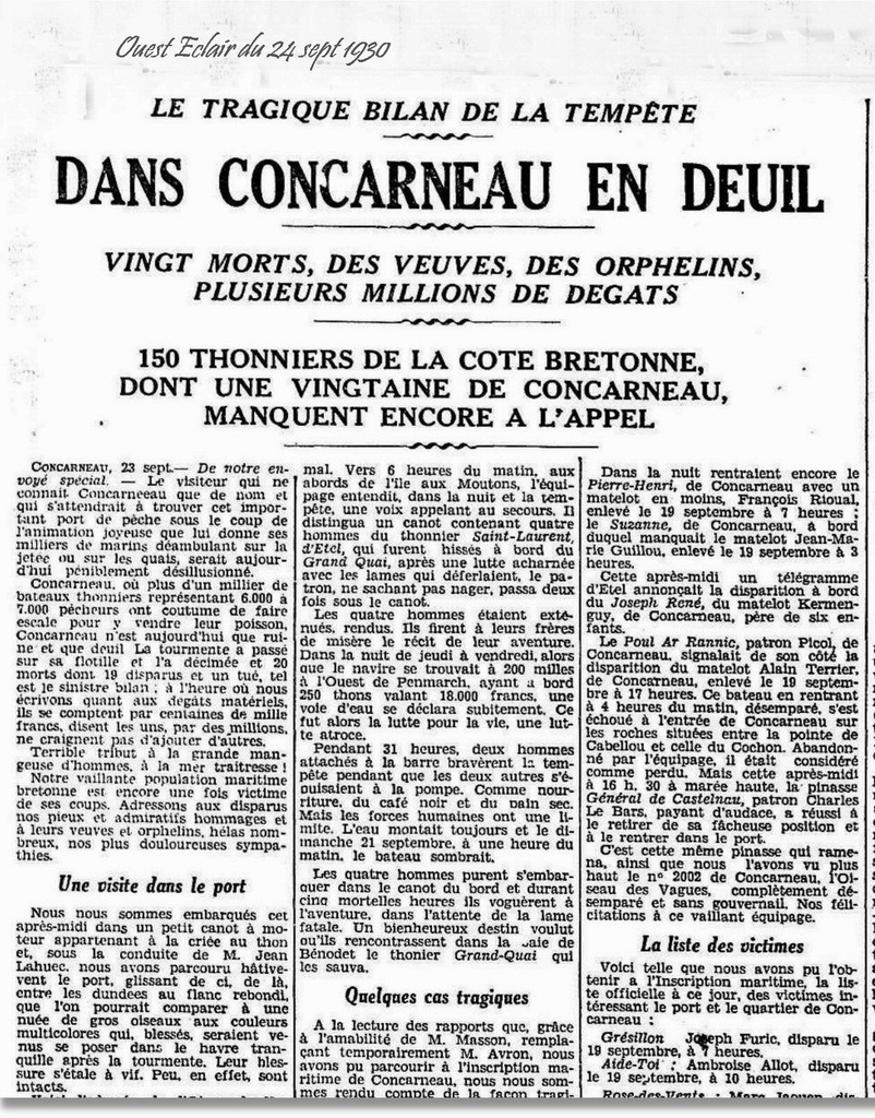 À la marée d’équinoxe des 19 et 20 septembre 1930, un ouragan se déchaîne sur les côtes bretonnes, 27 thoniers sombrent, 207 marins disparaissent laissant 127 veuves et 184 orphelins.