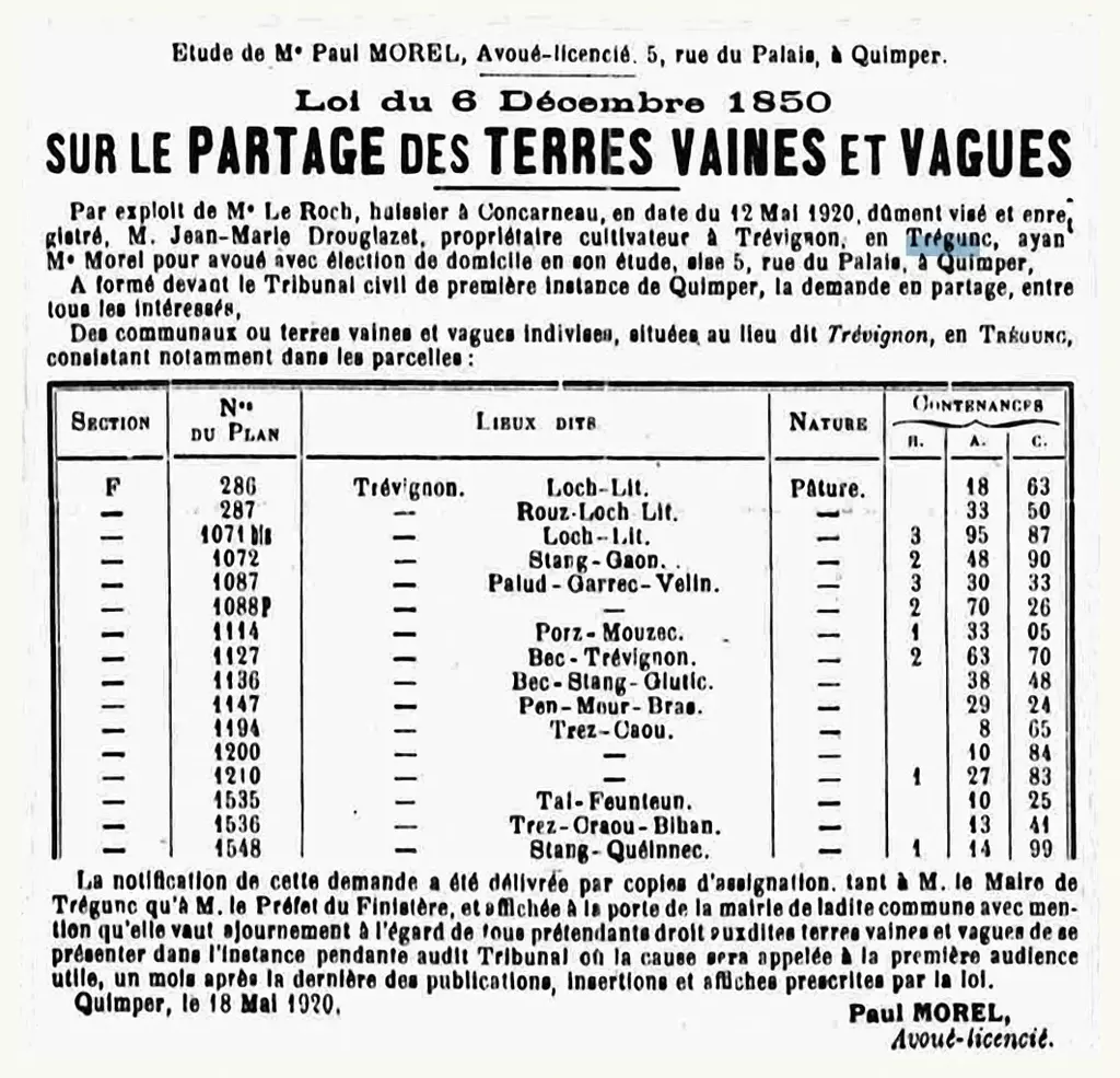 Le 22 mai 1920, les lecteurs du Progrès du Finistère découvrent l’encart publié par Paul Morel, avoué à Quimper, annonçant la demande en partage entre tous les intéressés des terres vaines et vagues de Trévignon, conformément à la loi du 6 décembre 1850. Cette demande a été produite devant le tribunal de première instance de Quimper par monsieur Jean-Marie Drouglazet, propriétaire cultivateur à Trévignon. La publicité est complétée par l’apposition d’une affiche à la porte de la mairie et par l’annonce à la sortie de la messe les deux dimanches suivants.