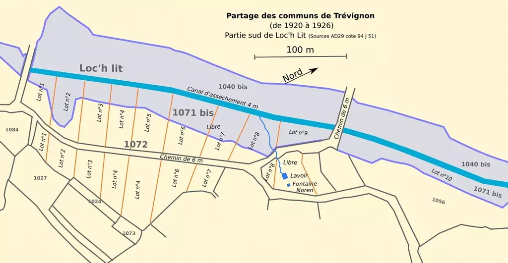 La parcelle 1071 bis est partagée en onze lots et les parcelles 286 et 287 en deux lots. Lʼaccès à la fontaine, Feunteun Norenn, et au lavoir est libre. Sur le plan de partage, il est prévu un canal d’assèchement de quatre mètres de large et un chemin qui traverse l’étang du sud-est au nord-ouest. Ces travaux ont-ils réellement été réalisés ?