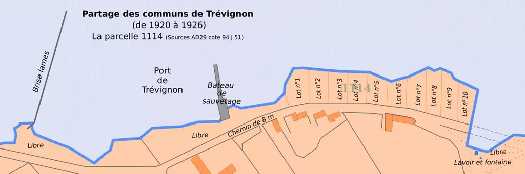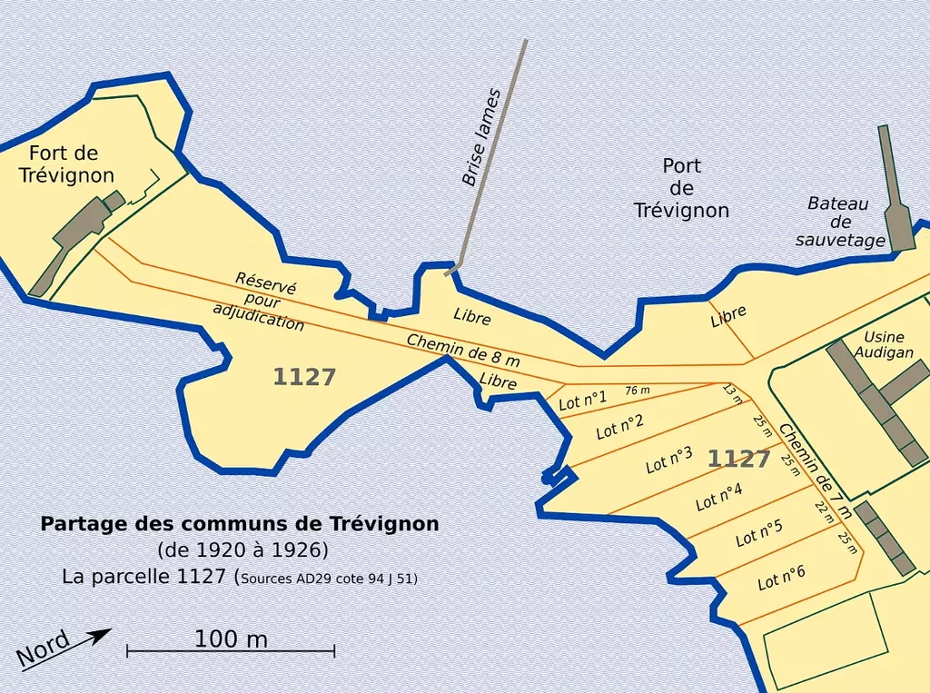 Le partage de la parcelle 1127 appelée Beg-Trévignon se fait selon trois critères : la partie située devant le fort de Trévignon fera l’objet d’une vente par adjudication, la partie donnant sur le port et le bateau de sauvetage est laissée libre d’accès, un accès à la mer est laissé par le sud-est et le reste est partagé en six lots.