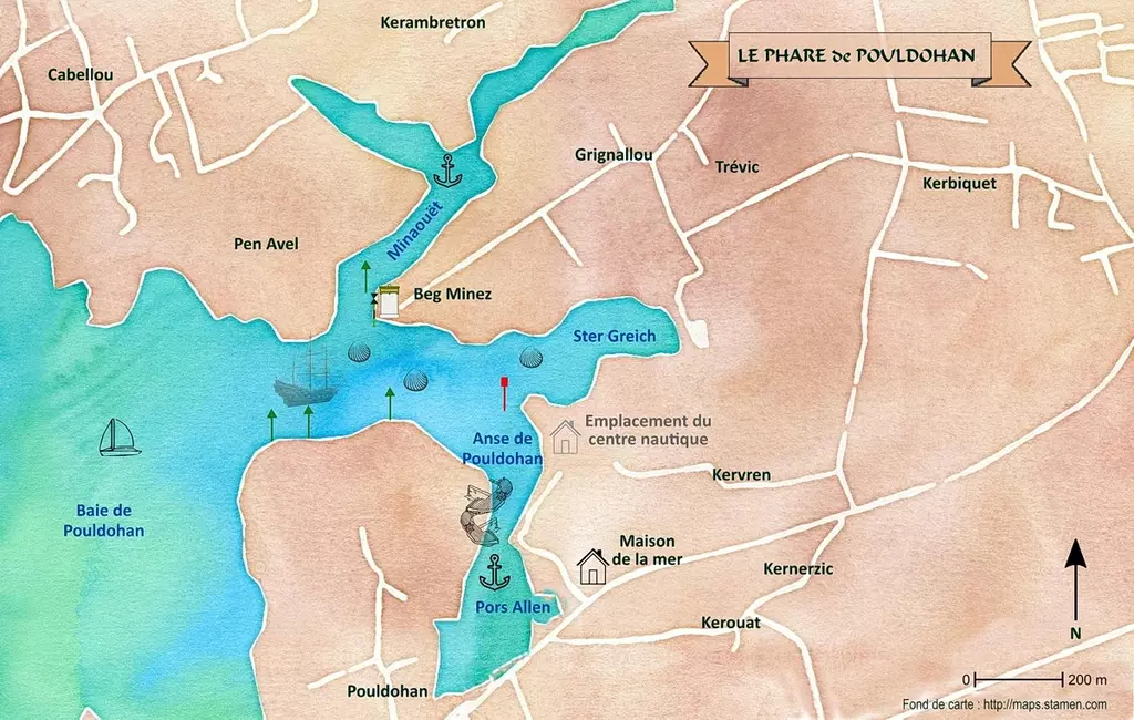 Lʼentrée dans l’anse de Pouldohan par la mer se fait par le chenal sud côté Pouldohan en évitant le banc de sable central. Plusieurs rias se rejoingnent : le Minaouët, la rivière centrale de Ster Greich et la vasière de Pors Allen et de Pouldohan, autant d’abris pour les bateaux.