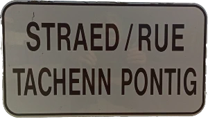 ♦ Ⓕ : Straed = "rue", Tachenn = "terrain, champ", pontig de pont = "pont" + suffixe diminutif ig, "La rue du champ du petit pont"