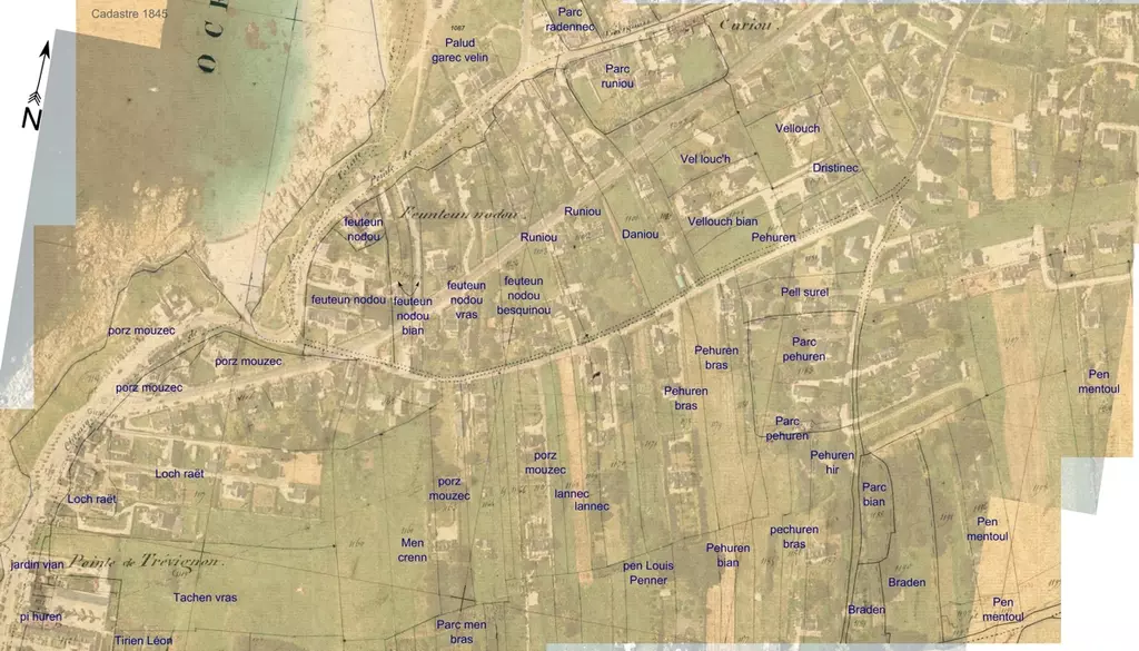 À Trégunc, par exemple, l’ancien cadastre établi entre 1845 et 1846 (plans et matrices) recense non seulement la situation des parcelles, mais aussi leurs noms, révélant ainsi une riche cartographie historique.