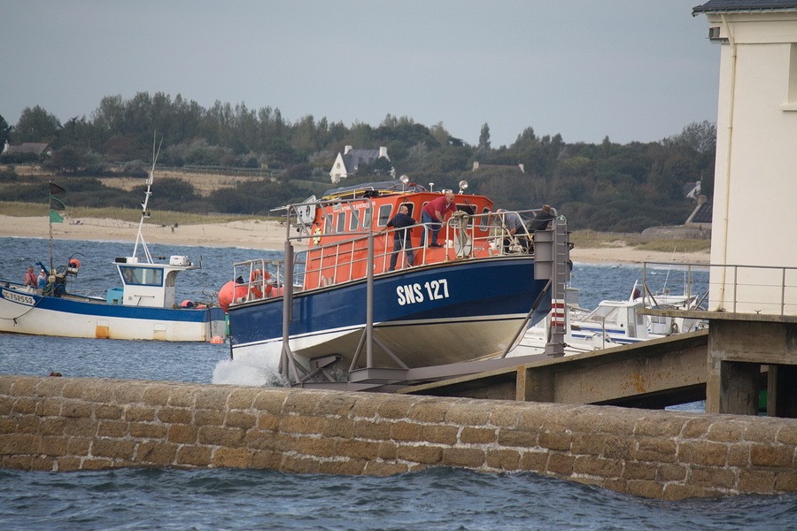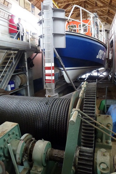 Le lancement du bateau de l’abri vers la mer est une opération délicate. L’ensemble doit filer régulièrement avec un contrôle manuel du frein de descente : trop rapide il y a des risques de déraillement, trop lent c’est le bateau de sauvetage qui ne se sépare pas de son chariot lorsqu’il rencontre son élément.