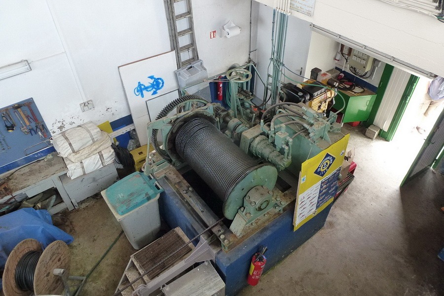 Pour mettre à l’eau le bateau et son chariot, ou pour les monter dans l’abri, deux rails sont installés sur la cale de lancement. La remontée du bateau dans son abri est effectuée par le treuil de hissage construit à Lorient par les établissements Laurence, devenus par la suite les Treuils Philippe. De construction mécano-soudée, le treuil est équipé d’une grande couronne dentée et d’un gros pignon, les deux taillés dans la masse par une machine spéciale. L’engrenage permet ainsi une grande multiplication de la force de halage. Le treuil mécanique installé depuis 1954 assurait la manœuvre des deux canots, le Duguay-Trouin et ensuite le Patron-François-Hervis.